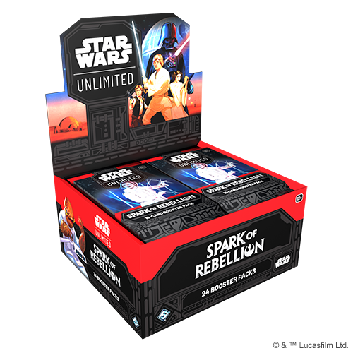 In this booster pack display for the game’s first set, Spark of Rebellion, players will find 24 individually wrapped booster packs. Each pack contains 9 common cards, 3 uncommon cards, 1 rare or legendary card, 1 leader, 1 base/token, and 1 foil card.The Spark of Rebellion set features characters and content from the original Star Wars trilogy, Rogue One: A Star Wars Story, and the Star Wars: Rebels series, and more!