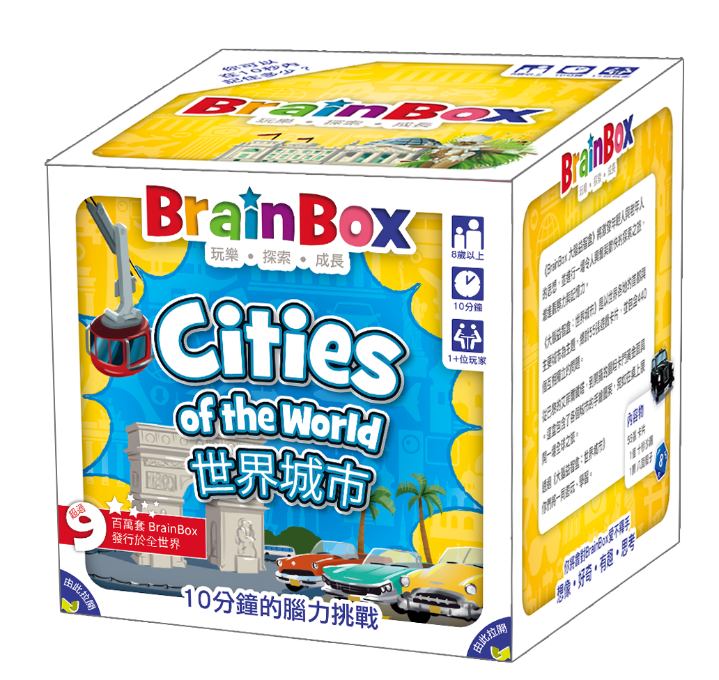 BrainBox設計讓孩童認識更多國家,以幫助他們在關鍵發展階段增進觀察力與記憶技巧。每張卡片涵蓋世界奇觀及世界文化自然遺產。這款遊戲是珍貴的學習工具,且充滿樂趣!遊戲製作包裝的紙板是使用至少70%的再生材料所生產並可回收再利用。