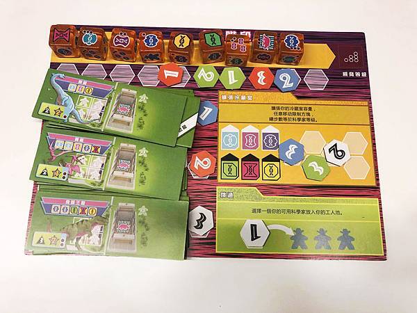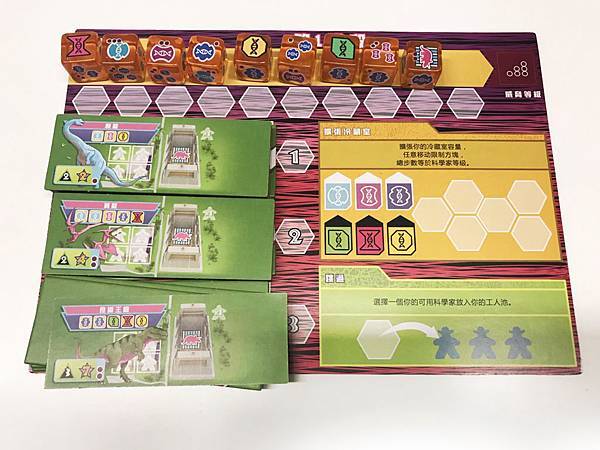 ▲研究階段:玩家輪流將三個研究生放置到版圖上搜集DNA,研發恐龍配方,或是增加DNA儲存上限。